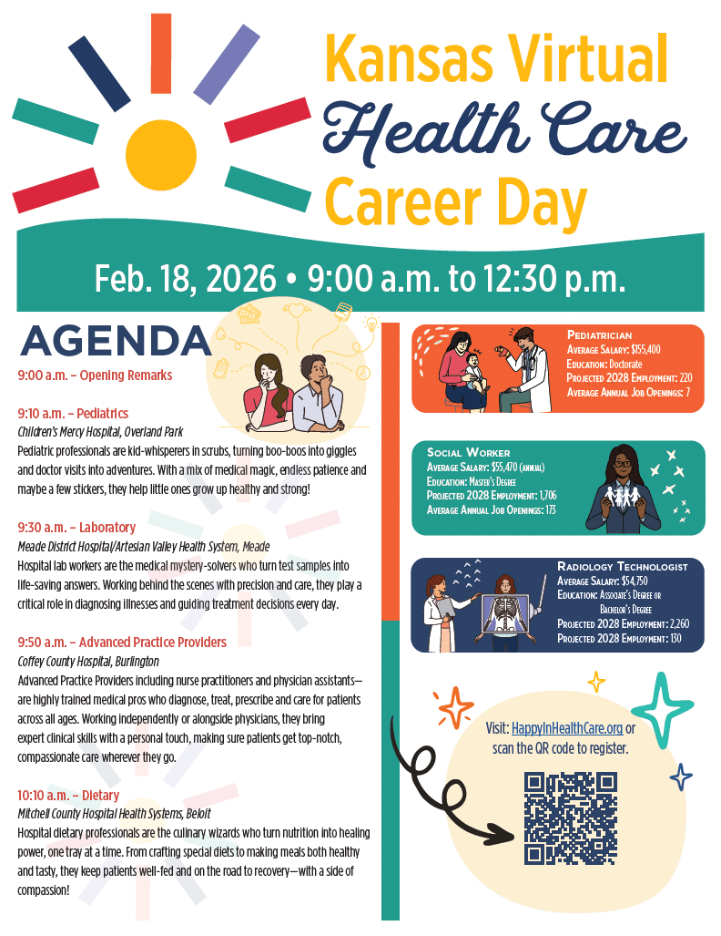 View the full agenda from our 2026 Virtual Health Care Career Day Flyer. It can be printed and shared in schools, at meetings, or other events as we promote Kansas’ largest health care career event to be held Feb. 18, 2026!